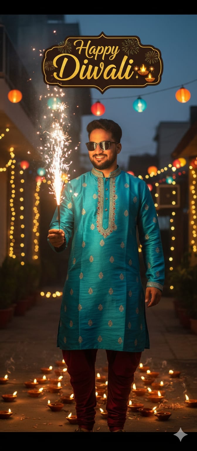 Hyper-realistic 8K full-body portrait of a stylish young man celebrating Diwali. Wearing vibrant kurta and ethnic pants, he lights sparkling fireworks surrounded by glowing lamps. Black sunglasses, festive vibe Background: 'Happy Diwali' in stylish font with emojis. Use uploaded reference image for exact face and hairstyle. Ultra-detailed, cinematic warm lighting, dynamic festive composition."