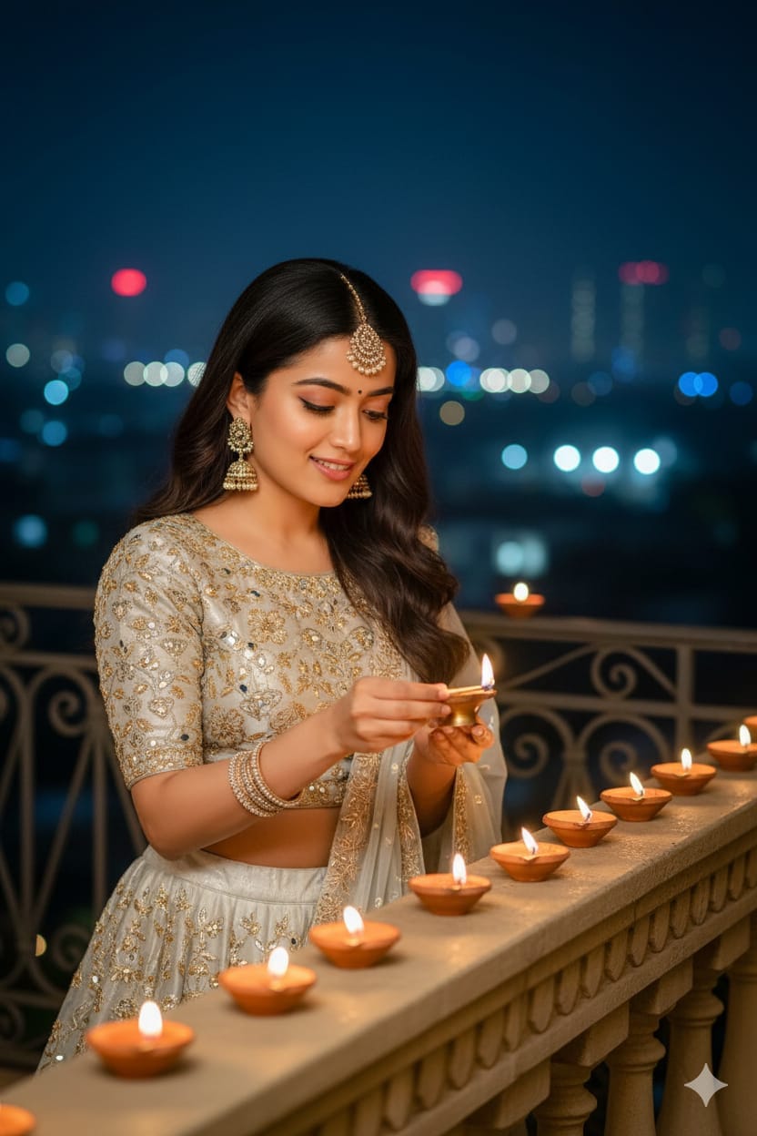 A beautiful South Asian woman, celebrating Diwali, dressed in a traditional silver lehenga with intricate embroidery. She is lighting diyas on a balcony at night, with blurred city lights in the background. She has long, dark hair, traditional Indian jewelry including jhumkas and a maang tikka. The image should capture a festive and elegant mood, with warm lighting."