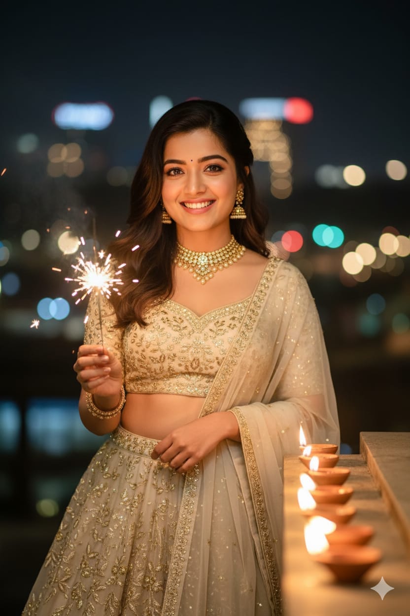 A happy woman, with features closely resembling my face, celebrating Diwali. She is holding a sparkler, and there are traditional Diwali lamps (diyas) lit in a row beside her. The background features blurred city lights at night, creating a festive atmosphere. She is dressed in a beautiful, light-colored traditional Indian outfit (lehenga choli) and adorned with festive jewelry. The overall mood is joyful and celebratory."