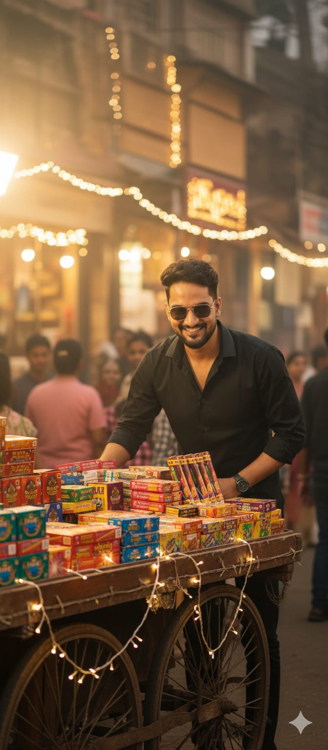 8K DSLR cinematic portrait of an 20-year-old slim Indian male in a black shirt and sunglasses, confidently standing behind a traditional wooden cart filled with colorful Diwali firecrackers in a bustling evening marketplace. Warm golden-hour lighting with blurred festive lights and people in the background.