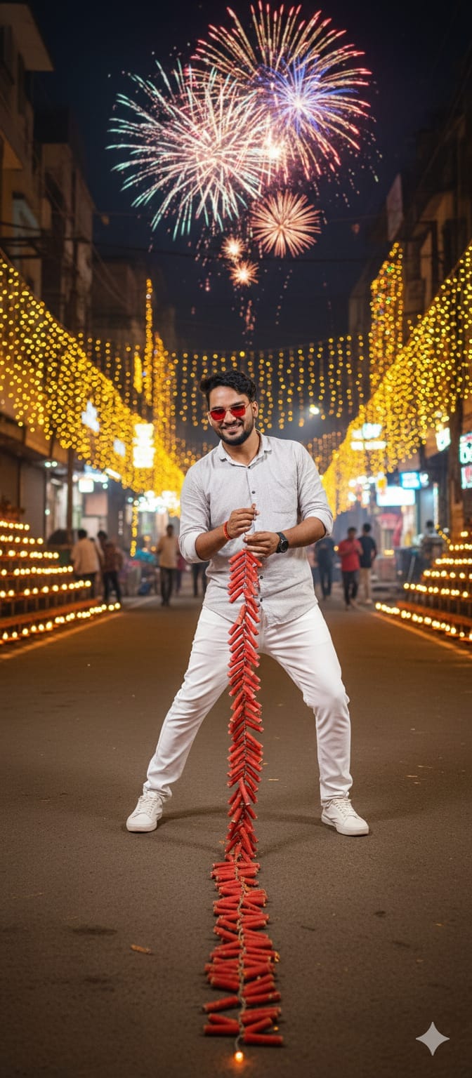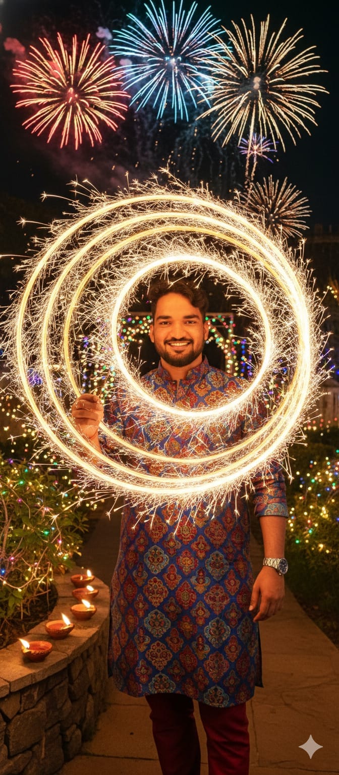ULTRA REALISTIC FESTIVE DIWALI scene. A 24 YEAR YOUNG INDIAN MAN STANDS CONFIDENTLY WEARING ELEGANT RAJSTHANI PRINTED WRISTWATCH, HOLDING A LIT FULL CHADI (SPARKLER) IN HIS HAND. THE SPARKLER GLOWS BRIGHTLY, CREATING A BEAUTIFUL GOLDEN RING OF LIGHT AROUND HIM AS HE WAVES IT IN THE AIR. HIS OUTFIT IS VIBRANT AND FESTIVE, WITH A SHINING DESIGNER KURTA AND PAJAMA. IN THE BACKGROUND, THERE ARE COLORFUL DIWALI DECORATIONS, GLOWING DIYAS, FAIRY LIGHTS, AND FIREWORKS BURSTING IN THE NIGHT SKY. THE ENTIRE Scene GLOWS