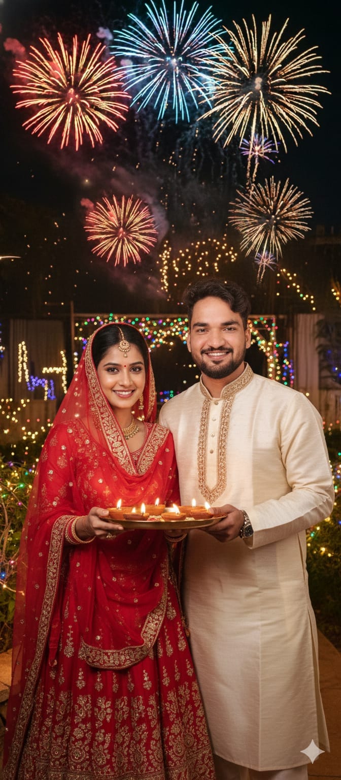 Background glows with rows of diyas, golden fairy lights, and blurred fireworks, creating a dreamy Diwali atmosphere. Cinematic shallow depth of field, ultra-realistic festive skin tones, 8K hyper-detailed sharpness.