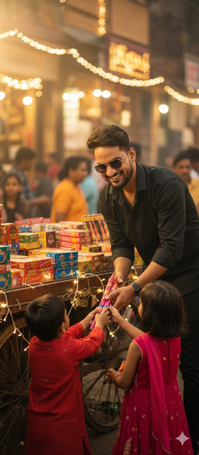 8K DSLR cinematic portrait of an 20-year-old slim Indian male in a black shirt and sunglasses, smiling as he hands Diwali firecrackers to two children in front of his traditional wooden cart in a bustling evening marketplace. Warm golden-hour lighting with blurred festive lights and people in the background.