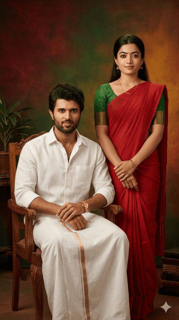 Studio backround.a highly stylized portrait of same men and women in image slightly with folded hands and the right one in a sitting in a wooden chair wearing white shirt and white vesti with golden chain and gold watch for men and women stand like near the chair with traditional red pleated saree with green blouse and minimal jewles unbuttoned at top, Against a bold vintage gradient backround sitting in confidently ensure to retain the 100% natural look from the picture without any changes in the facial looks of the right one, structure and everything should look same. The Facial looks of these mens Remains same, high detail, editorial photography style 4K. Resolution, Symmetrical composition minimal backround elements 9:16 ratio.Why AI Prompts Matter for Instagram Growth