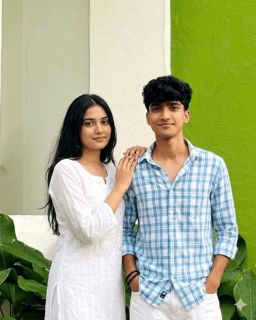 Include a beautiful 19–20 year old North Indian girl standing close beside me. She is dressed in an elegant Indian chikenkari kurti, with straight, open hair flowing naturally. Her hands are resting gently on my shoulders.