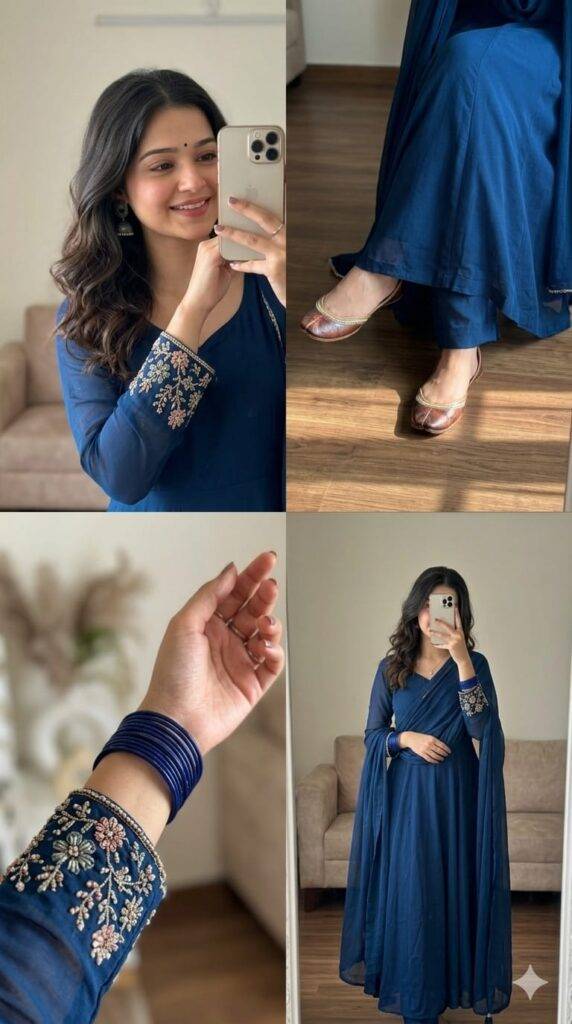 Bottom right: full mirror selfie i CAMERA STYLE (LOCKED) Shot on iPhone rear camera natural indoor lighting slight grain no cinematic blur no HDR exaggeration natural white balance handheld realism • OUTFIT (EXACT MATCH) deep blue traditional pakistani trending anarkali embroidered sleeves floral bead embroidery on cuffs matching loose pants matching dupatta same fabric texture no color change no outfit modification i POSES (EXACT REPLICATION) Panel 1 (Top Left): full face mirror selfie close-up hand holding phone in side of her face sleeve embroidery visible slight head tilt shoulder relaxed, subtle relaxed smile on her face Panel 2 (Top Right): sitting pose legs slightly forward shoes visible deep blue pants loose fitting neutral floor background Panel 3 (Bottom Left): wrist close-up arm slightly bent embroidery and bangles in focus soft indoor lighting decorative background blur Panel 4 (Bottom Right): full mirror selfie standing relaxed pose one hand holding phone covering face other hand down naturally dupatta draped loosely neutral room background sofa visible behind indoor home setting
