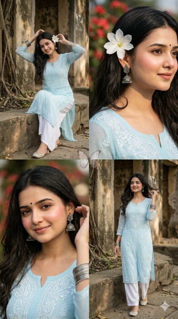 Create an ultra-realistic 4-panel vertical collage (2x2 grid) of a young South Asian woman wearing a soft pastel blue traditional kurta (fabric is lightweight, sheer georgette/chiffon with a graceful fall) with white patterns and white palazzo pants. The collage should feel natural, candid, and aesthetic like a Pinterest editorial shoot. Maintain the same face identity across all panels. She has long dark hair, loosely wavy with a few sleek strands falling across the front. Makeup is soft and glowy with prominent rosy blush and matching nude lips.Add a very small black bindi on her forehead.add a bunch of silver bangles on her hand.