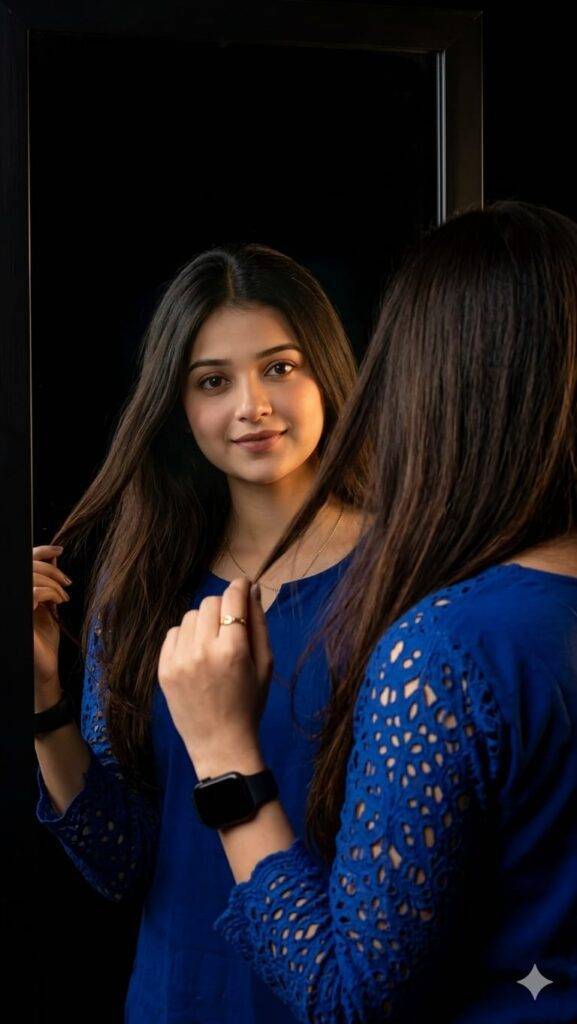 A hyper-realistic portrait of a beautiful young woman looking into a mirror against a pitch-black background. She is wearing a royal blue top with intricate lace cutout patterns on the sleeves. The composition shows her form from the back/side, while her face is clearly visible in the mirror reflection, looking slightly towards the viewer with a gentle, soft smile. She is holding a strand of her long, dark brown hair with one hand. She is wearing a black smartwatch on her wrist and a delicate necklace. Cinematic lighting, dramatic rim lighting highlighting the edges of her hair, soft fill light on her face, 8K resolution, photography style. I want exact same face as uploaded image, no alteration, 100% same.