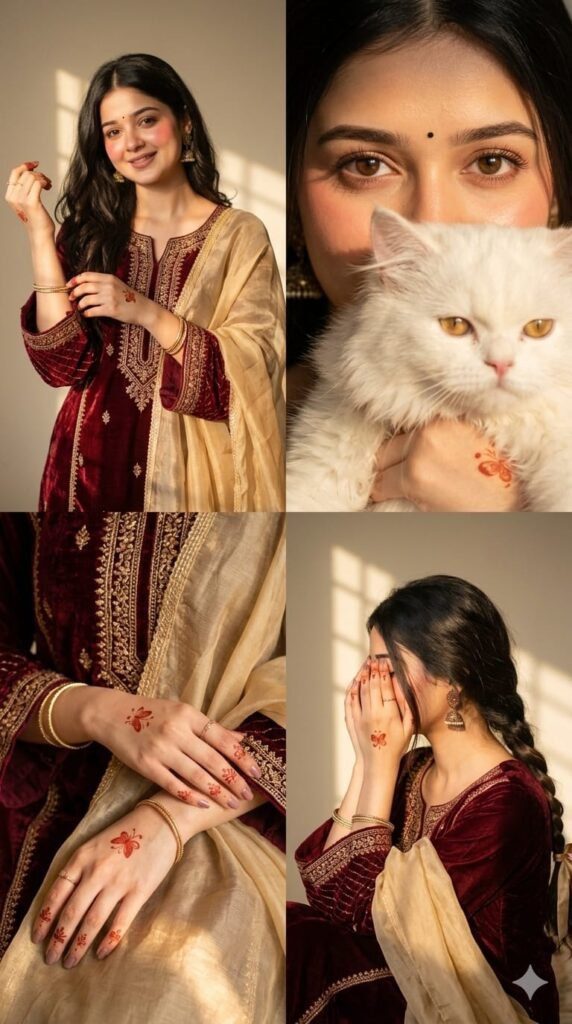 Hands decorated with minimalistic red mehndi (henna) designs featuring small floral and butterfly motifs. She is wearing delicate gold jewelry including slim bangles, a subtle ring, and traditional jhumka earrings.The collage is arranged in a 2x2 grid but composed vertically for a 9:16 frame.