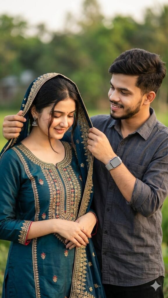Create a romantic outside of a young couple. the man is on the rights, gently adjusting the veil of the woman on the left, who is looking Down shyly. Both are smiling subtly.the women is wearing traditional Bangladeshi attire with a dark embroidered top and a matching dark veil.girls boys camera taraf looking the man is wearing a dark, textured collard Shirt and a smartwatches, the background is a soft blur of greeb foliage, suggesting a village of natural filed, 100% same face matching uploaded5y ya,
