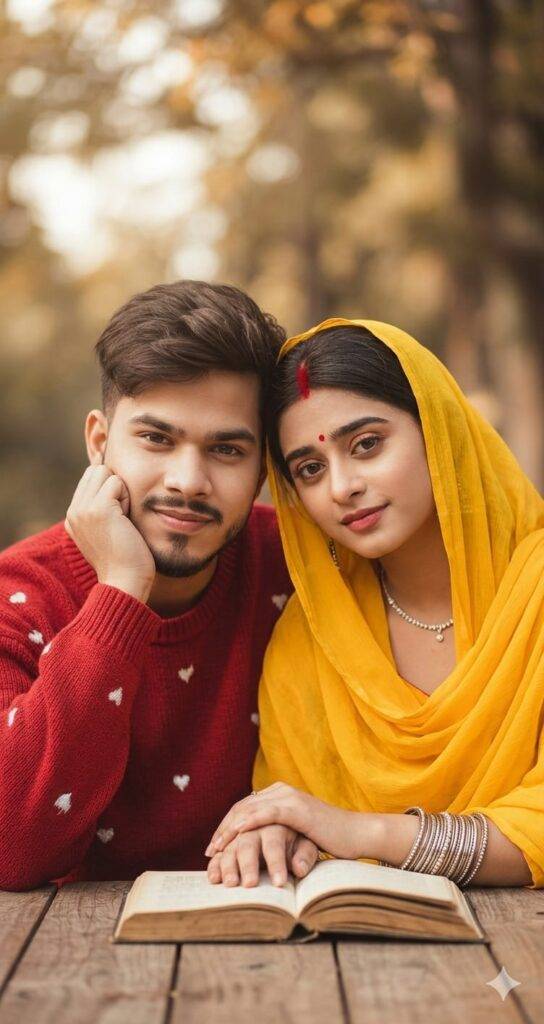 A warm, cinematic portrait of a young Indian couple sitting at a rustic wooden table outdoors. The man on the left is wearing a textured red sweater with small white heart embroidery, sporting a well-groomed beard and a modern fade hairstyle with a side-swept quiff. The woman on the right is wearing a vibrant yellow traditional dupatta draped over her head, featuring a red bindi and sindoor on her forehead, adorned with silver bangles and a delicate necklace. They are leaning in close together, their hands resting gently on an old book placed on the table. The background is a soft, creamy bokeh of autumn trees with warm, natural sunlight. High-detail skin textures, soft lighting, 8k resolution, romantic and serene atmosphere.