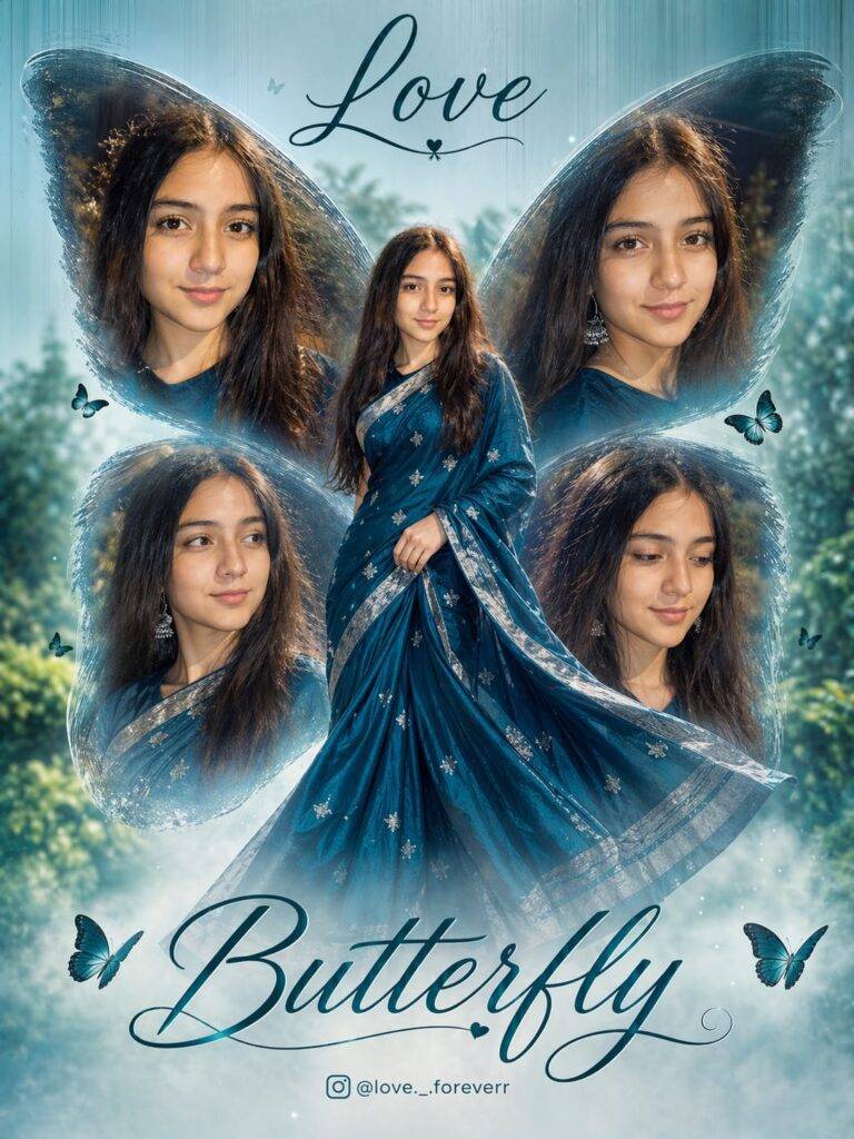 A dreamy, cinematic butterfly-themed portrait of a beautiful young Indian woman wearing an elegant teal-blue saree with silver embroidery. The composition features a central full-body pose of the woman standing gracefully, surrounded by four close-up portraits of her face forming symmetrical butterfly wings. The wings are soft, glowing, and semi-transparent with a magical, ethereal texture.