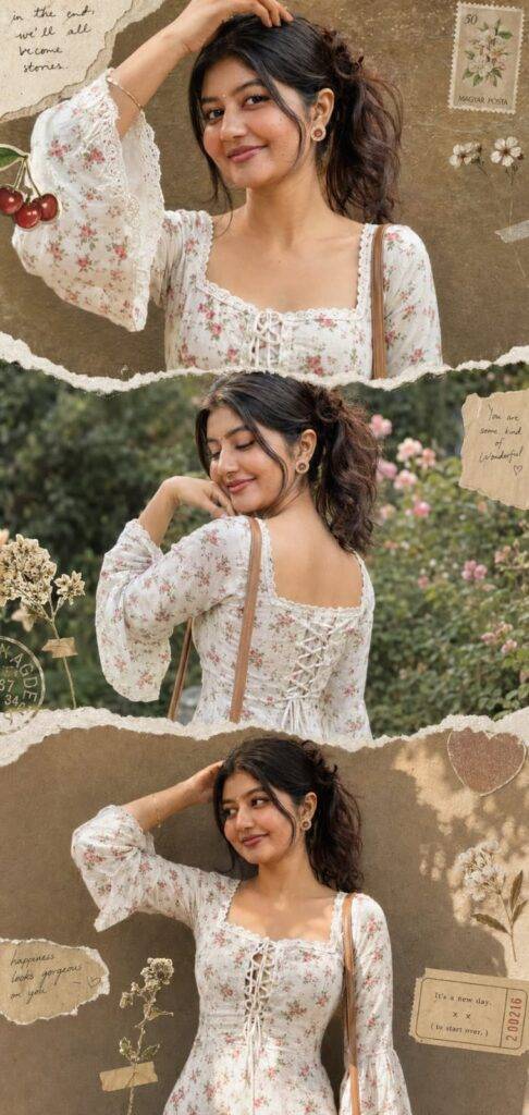 ABSOLUTE FACE IDENTITY LOCK (HIGHEST PRIORITY) Use my uploaded reference image as the ONLY facial identity source. Face must match exactly 99-100%: same face shape same jawline same eyebrows same nose structure same lips same skin tone ,hairstyle:-She has long dark hair, loosely wavy with a few sleek strands falling across the front. (adapt naturally) no beautification no gender change in facial structure no face mixing no Al-style smoothing keep realistic skin texture Makeup:-Makeup is soft and glowy with prominent rosy blush and matching pink natural lips.add a very little black bindi on her forehead.* EXACT COLLAGE LAYOUT (MUST MATCH) Create a
