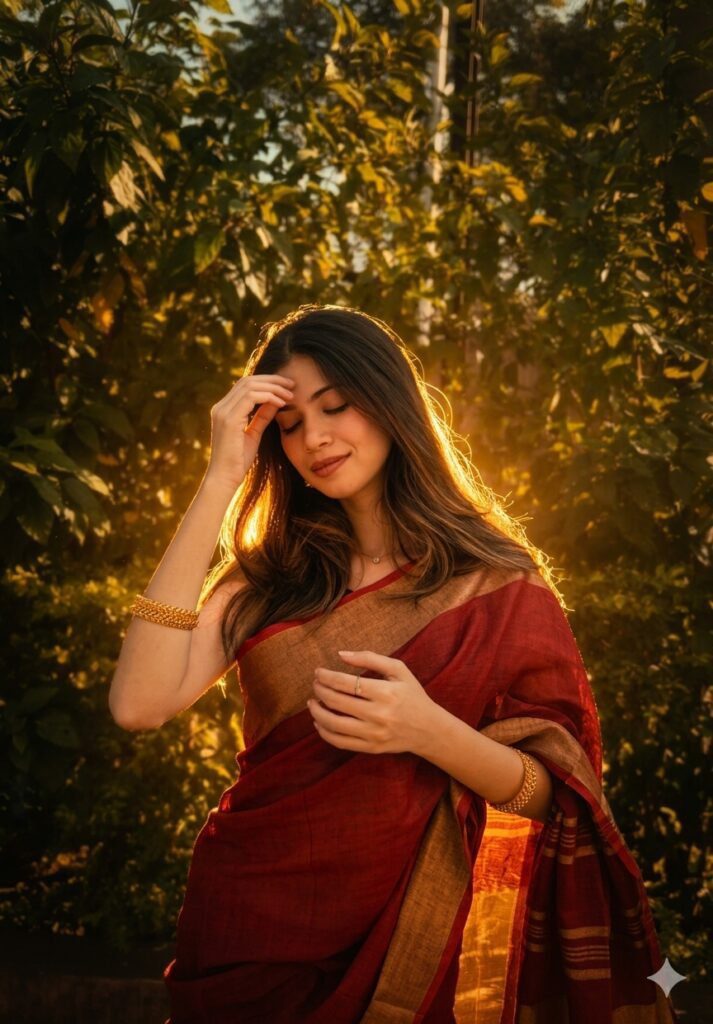 A cinematic, high-resolution portrait of a young woman standing amidst lush green foliage during the golden hour. She is wearing a deep maroon linen saree with a thick antique gold border and matching gold bangles. Her long, dark brown hair is styled in soft waves, glowing from a strong backlight that creates a shimmering "halo" effect. She has a serene expression with her eyes closed, one hand gently touching her forehead and the other resting near her waist. The background is filled with sun-drenched leaves, creating a warm, amber-toned bokeh. The lighting is soft and ethereal, emphasizing rich textures and a peaceful, nostalgic mood.