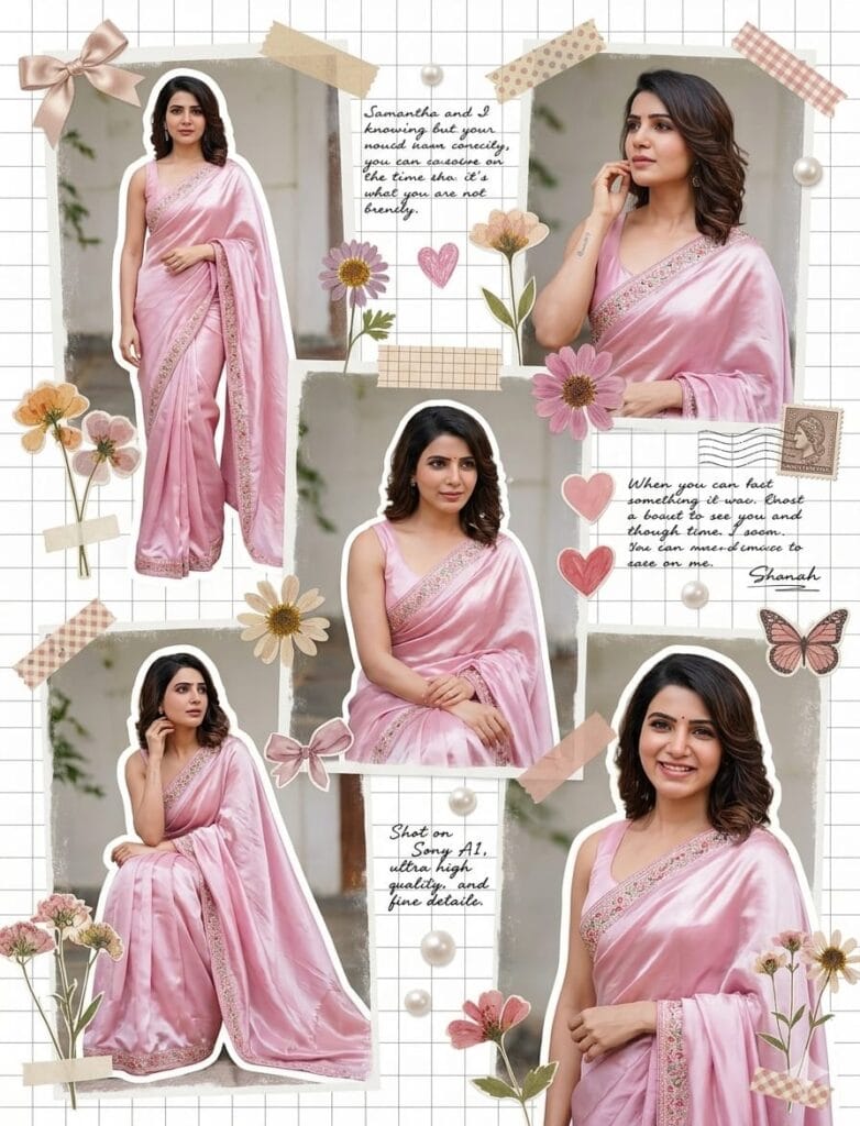 Dreamy scrapbook collage aesthetic of a girl in a shiny pastel pink saree, multiple angles and poses. Added stickers: bows, flowers, hearts, butterflies. White grid background, cut-out effect, cute decorative elements. Soft lighting, smooth skin, feminine aesthetic, Pinterest-style moodboard, ultra high quality.