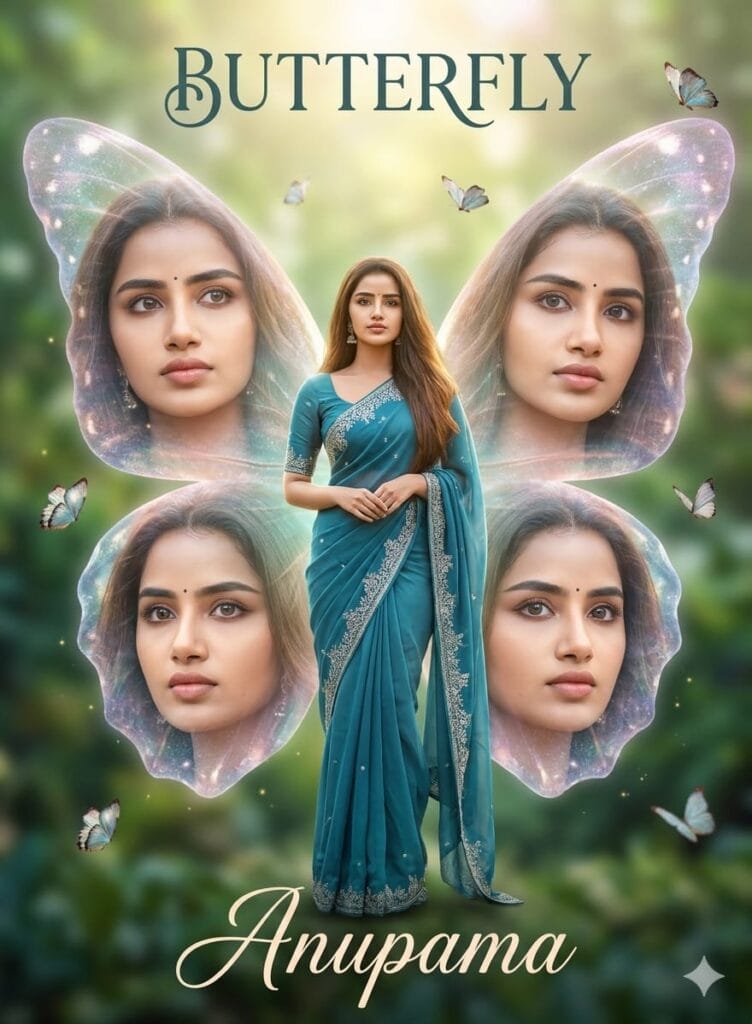 Add stylish typography text ‘BUTTERFLY’ at the top and ‘Anupama’ at the bottom in elegant cursive font. Ultra-realistic, high detail, 4K quality, cinematic color grading, soft focus, depth of field, symmetrical composition, fantasy photo manipulation."